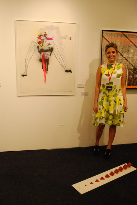 Clarissa Lima in front of two Rodrigo Tizil Lima pieces. Huma Art Projects, Rio de Janeiro/Pinta photo by A.M. Ekstrand for ArtObserved