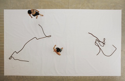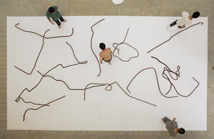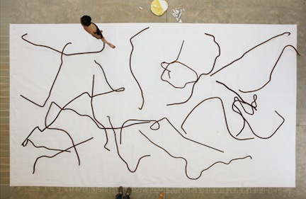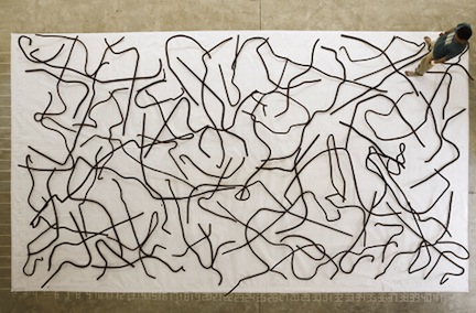 At the second Mary Boone location in Chelsea, writhing steel rebar is placed on the floor in a carefully planned pattern, which is mirrored by a photograph on the wall of the same rebar. A documentary of the installation process is also showing. The effect of twisting, dancing rebar is engaging, even fun – until you hear the political context.