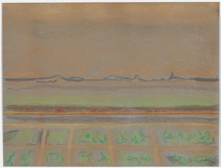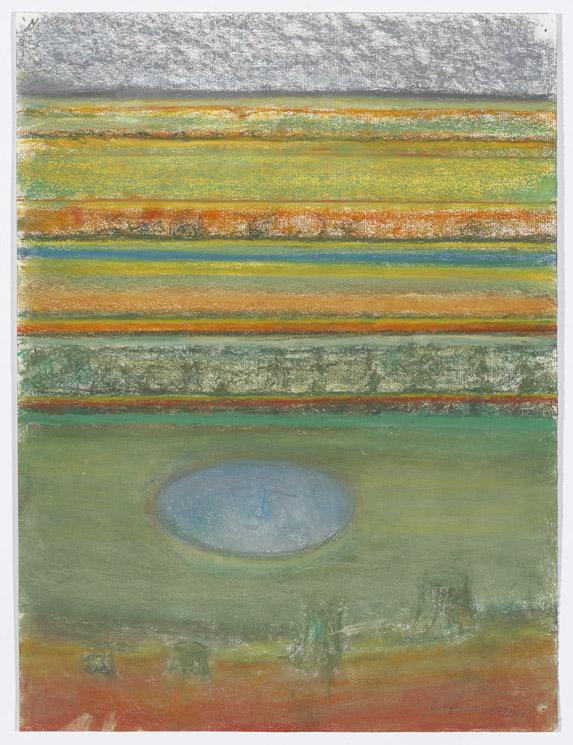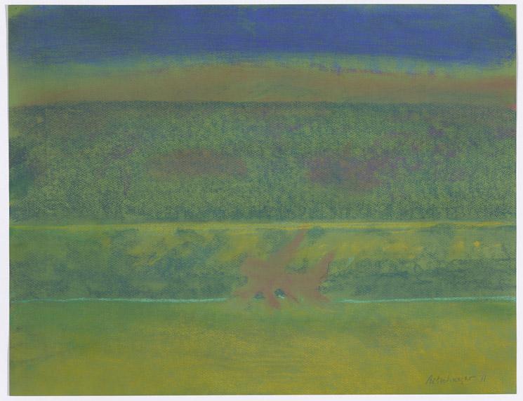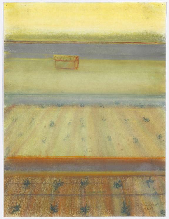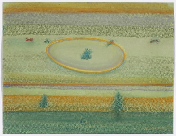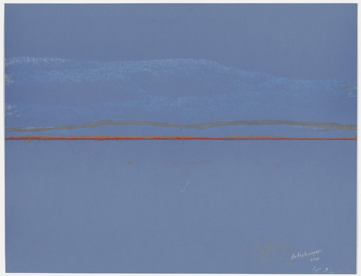 “In the recent drawings, the master of faux furniture and monochrome interiors has gone outdoors, into a kind of high-chroma farmland of the mind. Tabletops have become fields. Bands have become highways. The ‘blps’ and spuds of earlier drawings are now watermelons, ornamented with radiant green mottling that seems to reprise the fields where they grew. Garishly beautiful and ebullient, these pastoral hallucinations hark back to the horizontal line drawings of the late sixties, and beyond them, to Artschwager’s earliest exhibited work: the abstract landscapes that Donald Judd admired back in 1959, with their ‘quick, spiked strokes, …communicative of abbreviation.'” -Alexi Worth, 2008