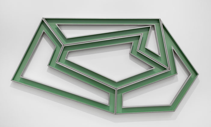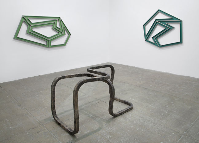 In one series of four works, the artist twists wooden frames to resemble Paul Klee’s freehand line drawings, then coats them with metallic dusts.  Naming them after the various metals the works are made to resemble, Deacon twists the presentation of the sculptures in much the same way he twists their forms, challenging the conceptions of material, presentation and object as interrelated elements.