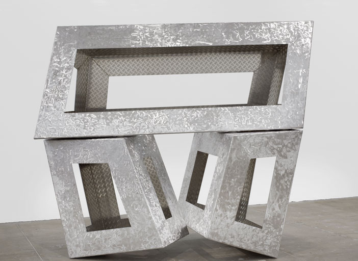 Working with both geometric forms and more loosely-rendered structures, Deacon’s work on view is tied together by its consistent presentation of texture as a foundational part of the work.  The artist plays with the textures of metal, moving from smoothly polished surfaces to diamond-plate steel, to pieces bearing vigorous, gleaming scuff marks.