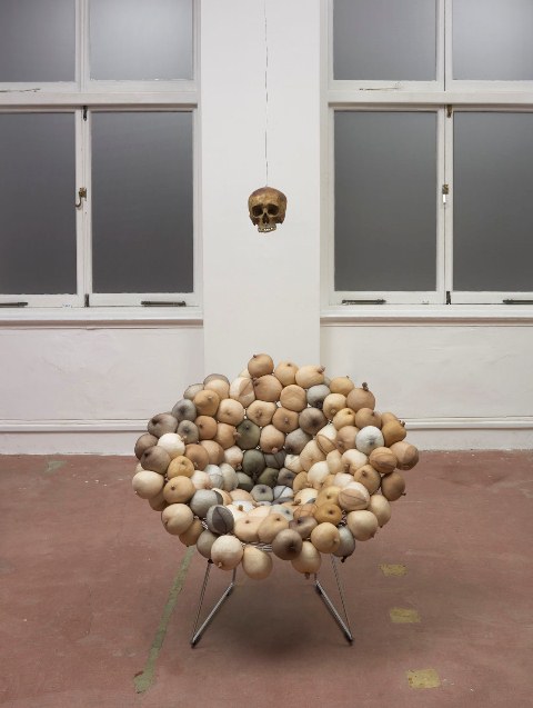 Sarah Lucas, Untitled (Tit Chair) (2012) and Skull(2000), via Sadie Coles.