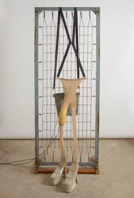 Situation Classic Pervery felt like the inner sanctum of a working-class backyard and living room. The organic look of Untitled (Tit Chair) (2012), a chair made out of stuffed stockings, renders the chair vibrantly alive, in stark contrast to the representation of death of Skull (2000), which hangs above it. Lucas has mentioned that she views all her pieces as “beasts,” and her work always returns to the body. Man versus human nature (2005), is an installation depicting a man wearing nylon stockings, suspenders and high heels. The character’s sex cannot be mistaken due to his large hanging penis, a mocking commentary on the debate of gender as biological or cultural.