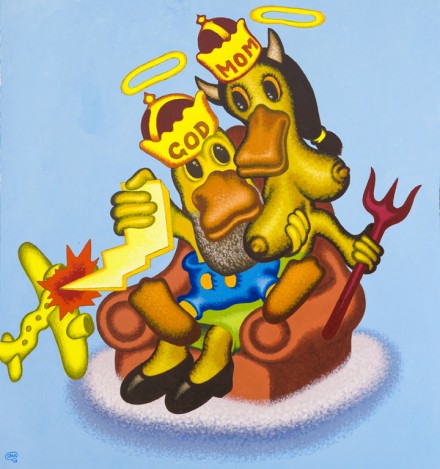 Mother of God (2012) for instance, shows an infantile God depicted as a duck sitting on the lap of his duck mother cupping her exposed breast in his hand. While haloes hover over both heads, God punctures an approaching plane with cartoon explosion, while his mother, looks on in devil horns and pitchfork. The political and religious implications here are volatile, but balanced out with a bizarre, juvenile rendering that keeps the work informed by a healthy sense of humor.