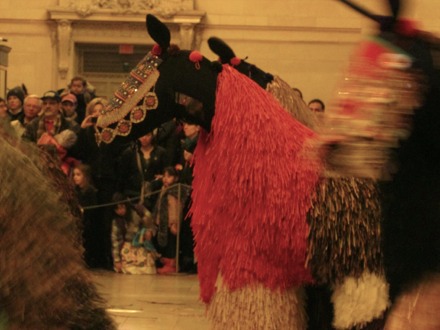 Reacting to the wearer’s movements, Cave’s Soundsuits swoosh and swish, engaging the audience on both visual and auditory planes, complemented by the actors’ playful mannerisms and thunderous synchronized movements. The horses coyly shake their manes and behinds to a giggling audience, playing up the performance. Accompanied by melodic live harp, percussion and drums, the presence of the animals reignite the ephemera space of the Terminal, temporarily transforming Grand Central from a mundane portal to something much more spectacular.