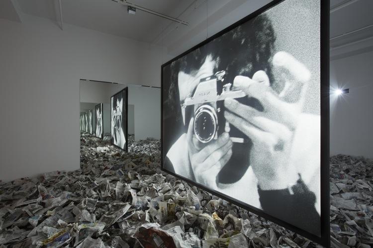 One floor below, McCall presents a look at another work, made several years before his premature retirement from the art world. Circulation Figures, made originally for a 1972 performance in which the artist filled room with shredded newspaper and mirrors and invited filmmakers to photograph and film each other, is presented here as a particular brand of homage. The completed loop of footage, compiled by McCall, plays endlessly on a projection screen in the center of the room, bisecting a set of parallel mirrors that project the space within their frames endlessly. Once again exploring the variations of position and perspective contained within a space, Circulation Figures becomes a fitting homage to the original event, when McCall created his own loop of practice, constantly capturing the act of creation in a space designed to infinitely repeat itself.