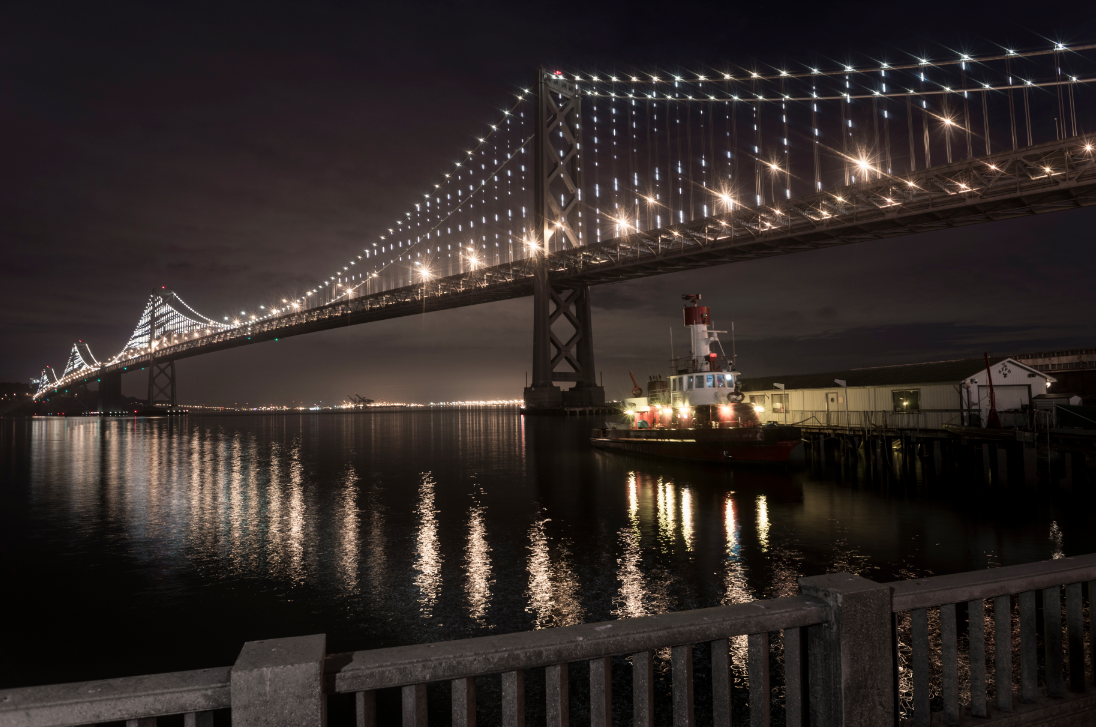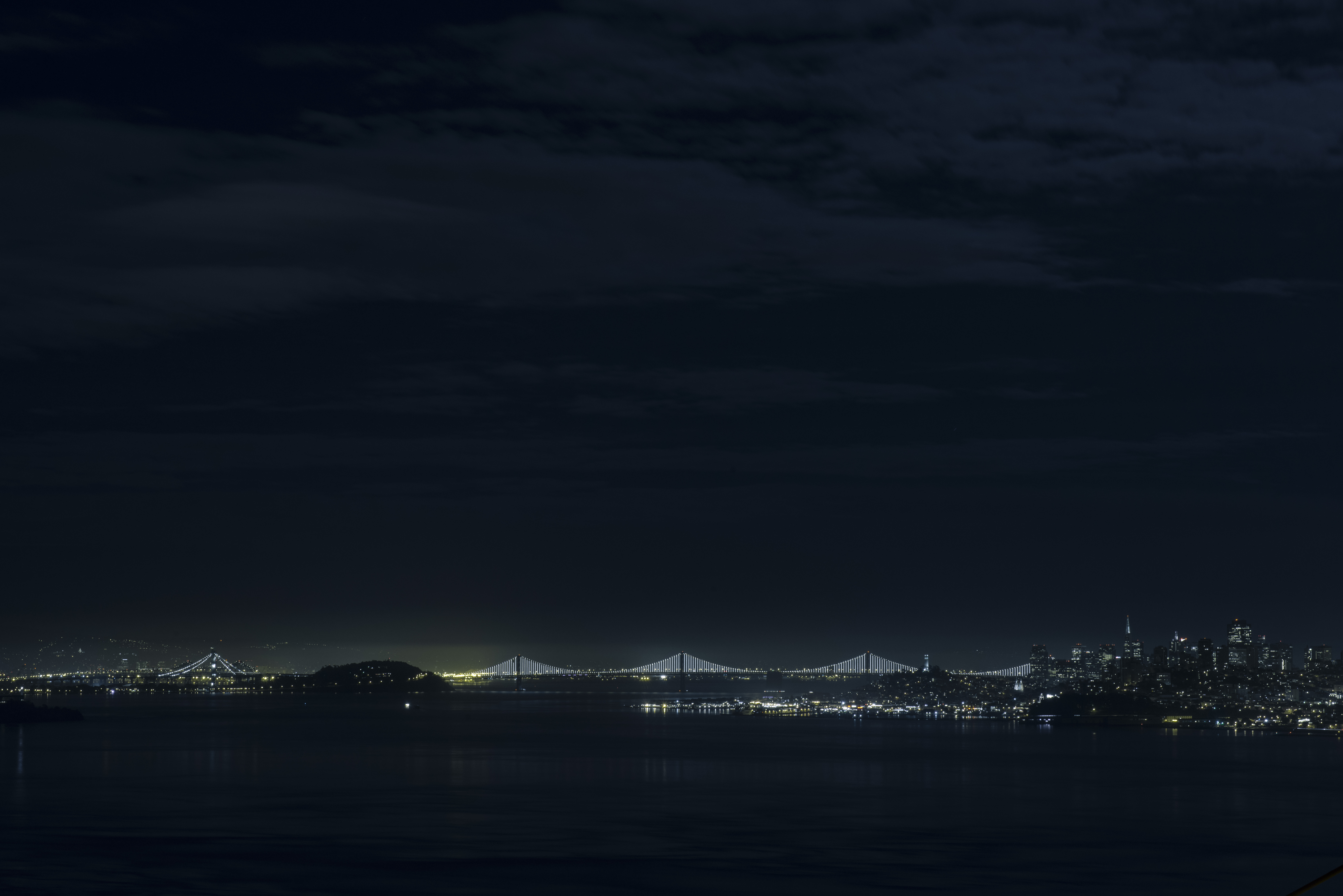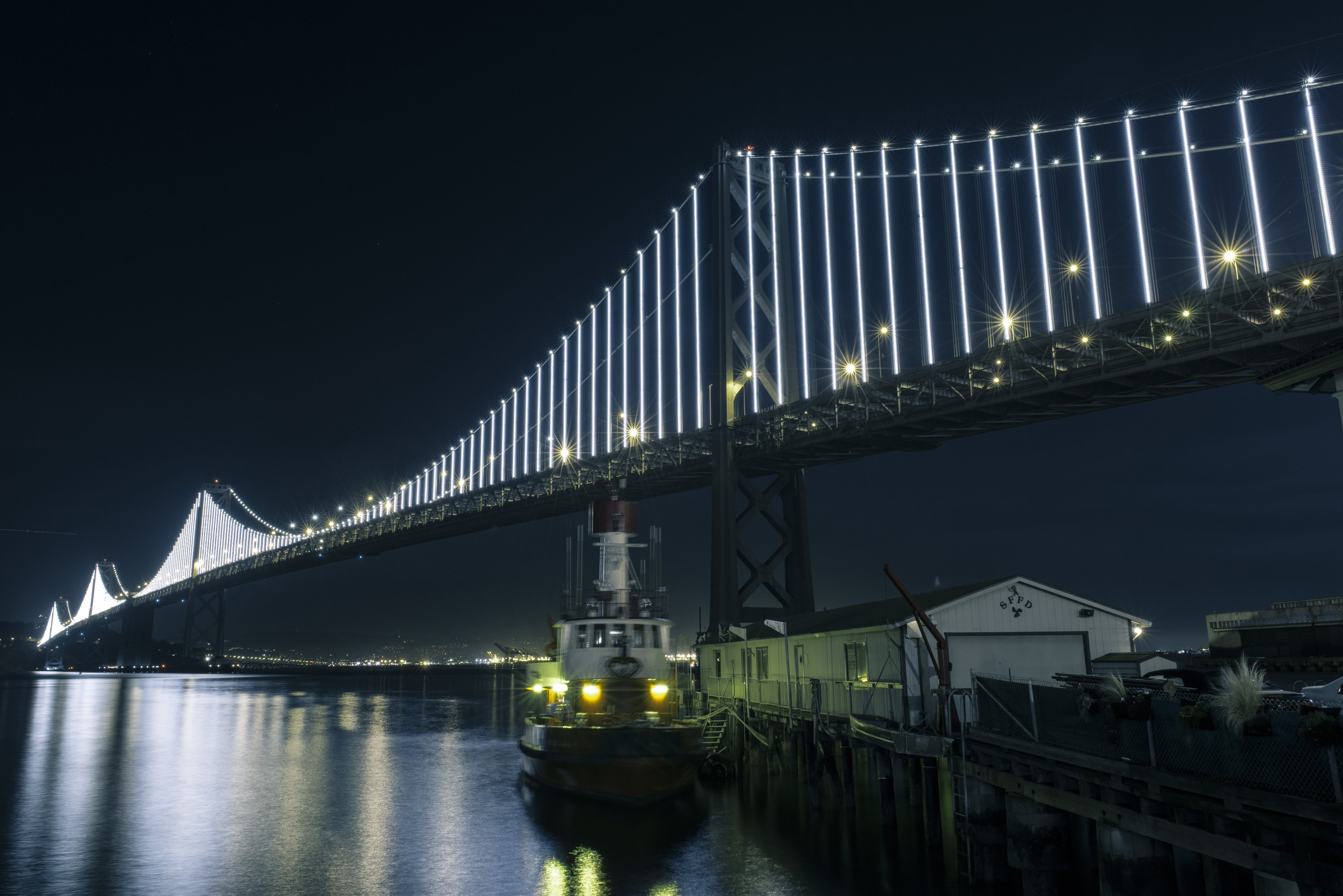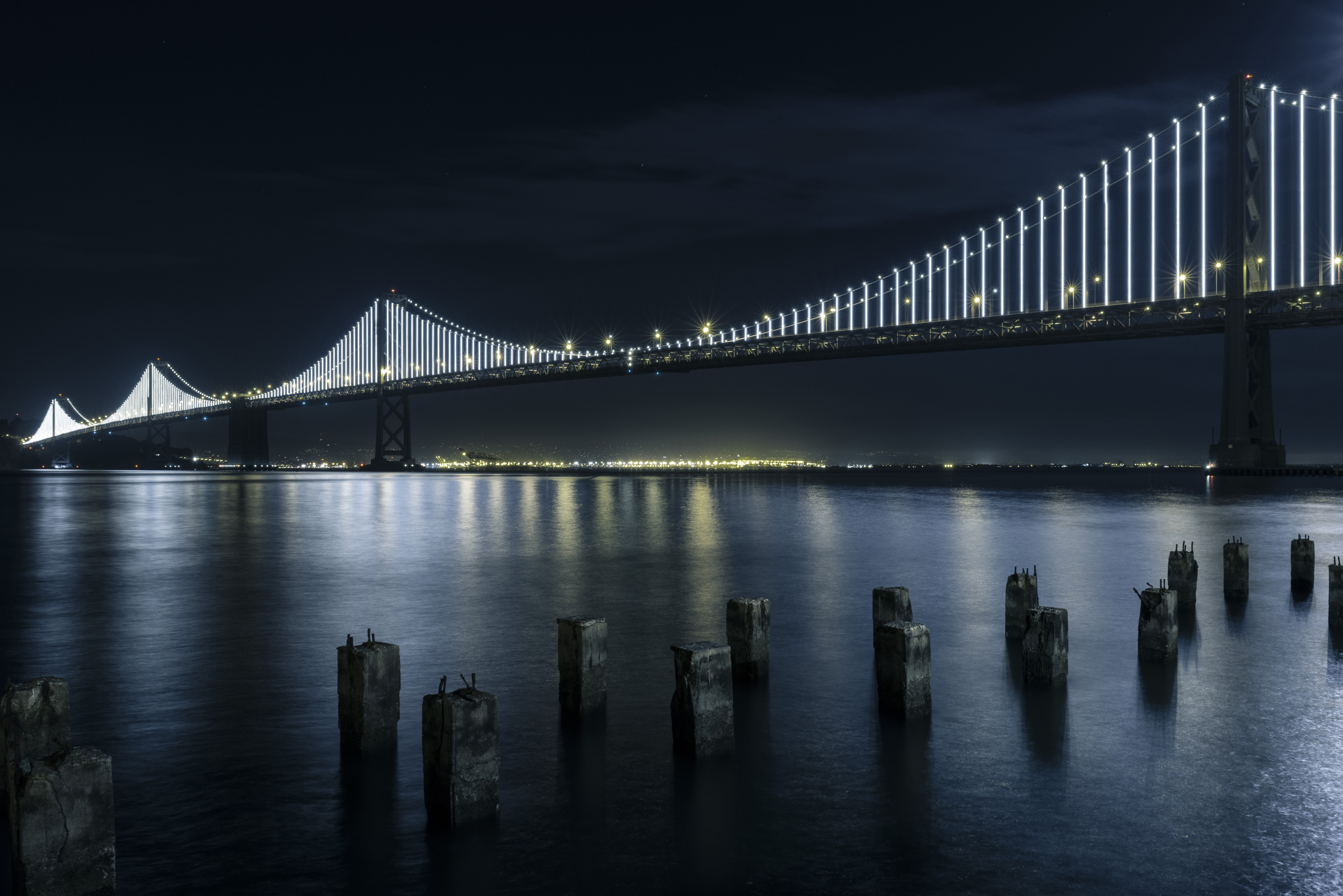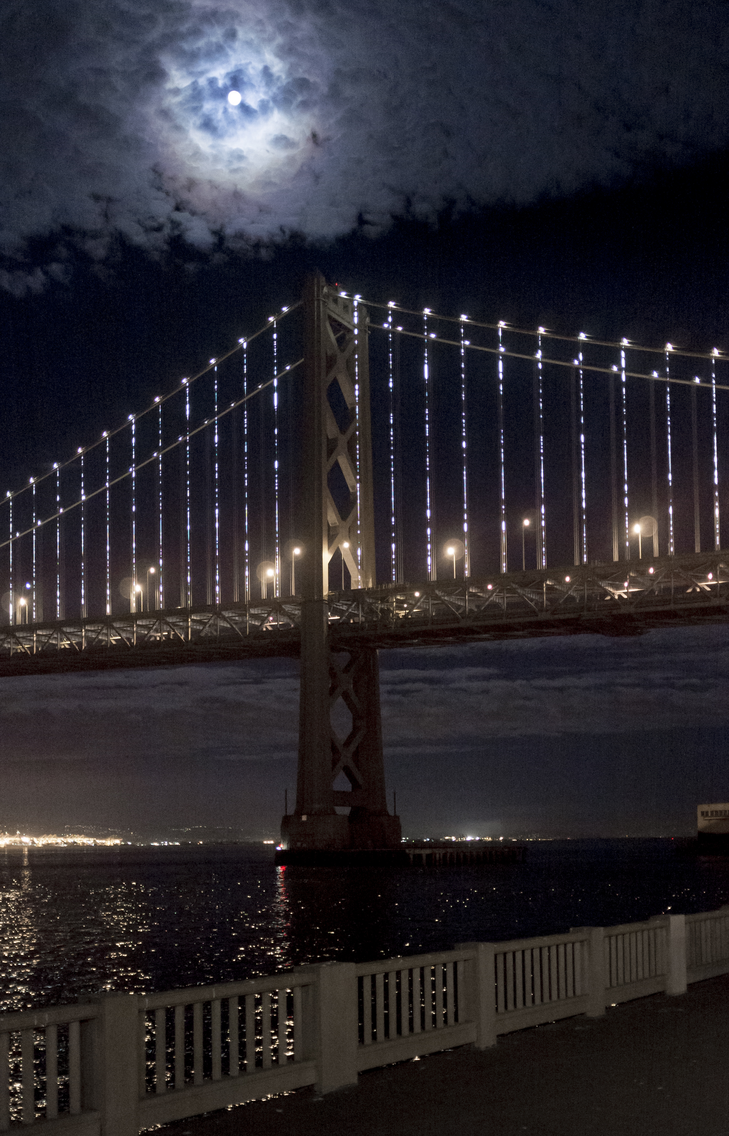 The Bay Lights play on the bridge as a point of synergy, a place of transition between bodies of land, water and air, repositioning its stature not only as a physical construction, but as a harmonically situated aspect of its environment. The steel girders and supports of the bridge are united into a singular surface, projecting a cohesive flow of light across the San Francisco bay. Accordingly, the space becomes a metaphor for itself, each movement of the lights entering into conversation with the directional vectors of the bridge and its traffic, and highlighting both the functionality and aesthetic essence of its construction.