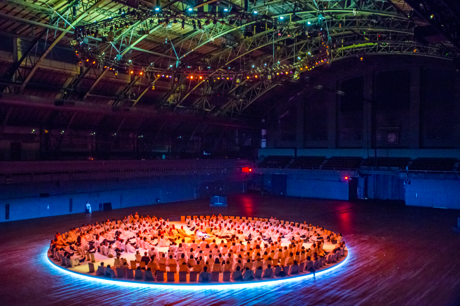 Notoriously minimalist in presentation, Stockhausen often asked that his electronic works (Oktophonie included) be performed in pure darkness, with perhaps a small moon of light projected on the ceiling. Welcoming a new exploration of Stockhausen’s work, the Armory asked Rikrit Tiravanija to redesign this experience, and the artist responded with a striking, circular seating arrangement that puts the viewer on the moon itself.