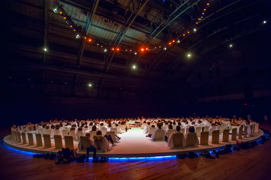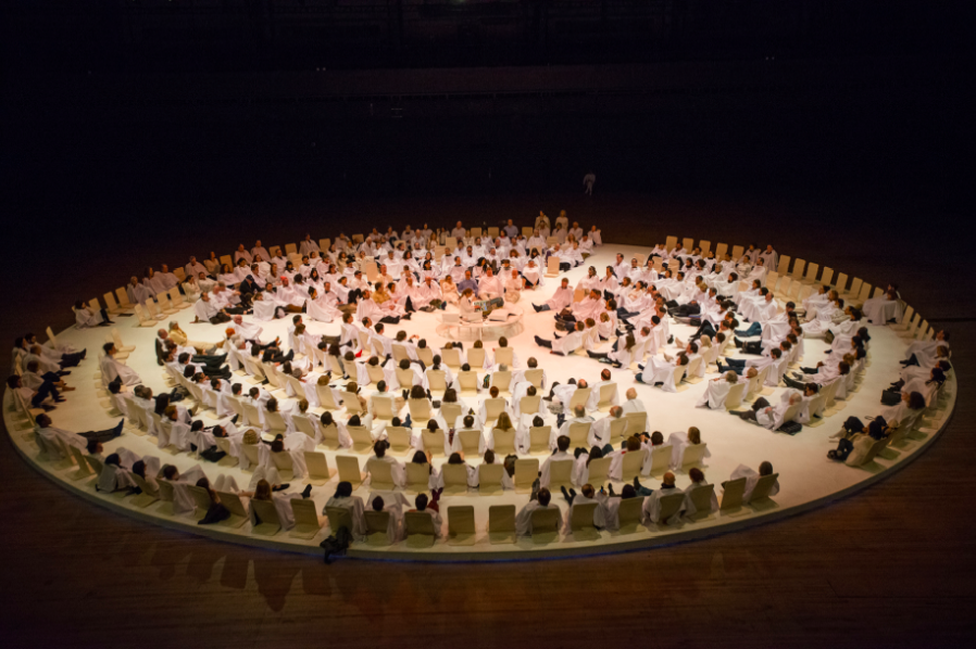 There is no escaping Stockhausen’s 70 minute soundscape in Tiravanija’s seating arrangement, turning the viewer inward towards the center of the circle. Dressed before the show in white robes, the audience must face nearly complete darkness, feeling a strange sense of connectivity while being inundated with Stockhausen’s score. Thunderous roars give way to shimmering clashes of sound, complemented by a gradual shifting of light overhead. The work is hypnotic in every sense of the word, slowly chipping away almost any outside perception to create a sense of stillness, lost in the storm of sound swirling overhead.