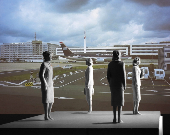 Dissolving from one image to the next, Fischli and Weiss address the slow, plodding sameness of the photographs on view, allowing iconic structures to blend with the commonplace images of airplane wings, landing strips and blue sky common to any airport. Four small, female sculptures look on, indefinite figures set against the backdrop of global exchange. Stuck between definite location and indefinite image, Fischli and Weiss combine these elements in a play on the meaning of identity in a world working beyond borders. The artists are also exhibiting a selection of their plaster car sculptures, a second selection of work that complements their interpretations of cultural forms, using the model’s own structural vagaries to draw out questions of completion, meaning and value placed on consumer objects and behaviors in contemporary life.