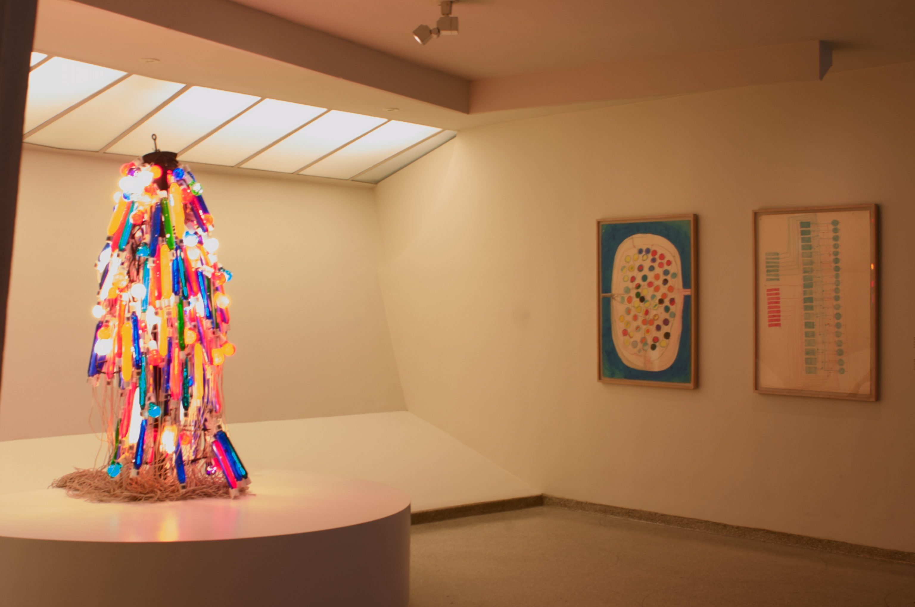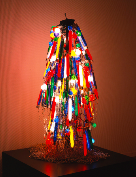 Tanaka Atsuko, Electric Dress (1956), (refabricated 1986). Synthetic paint on incandescent lightbulbs, electric cords, and control console, approximately 165 × 80 × 80 cm Takamatsu City Museum of Art, Japan © ItÅ RyÅji, courtesy Takamatsu City Museum of Art