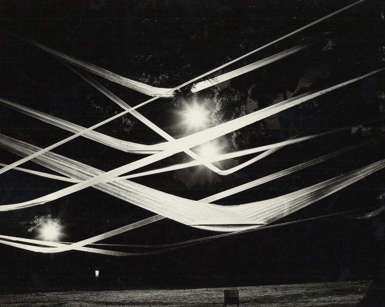 MOTONAGA Sadamasa, Work (Water) (1956), Polyethylene, water, dye, and rope, dimensions variable Installation view: Outdoor Gutai Art Exhibition, Ashiya Park, Ashiya, July 27-August 5, 1956 © Motonaga Nakatsuji Etsuko, courtesy Motonaga Document Research Office