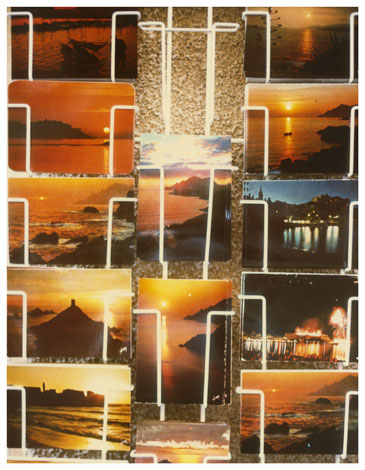 Calvi, a photograph of a postcard rack, is the perfect summation of these theories. Depicting a series of photographic postcards of island scenes divided by the wire racks holding them, the consumable nature of the image is foregrounded and multiplied, while standing as an abstractly rendered image in its own right. It becomes difficult to distinguish the work as collage or photograph, forcing the viewer to partially abandon the reality of the image itself in favor of that of a framed space, defined by its restrictions and inherent elements. From this abstracted, distant vantage point, the viewer is welcomed to return to the content of the image, examining the weight of meaning in each work, and how it speaks to larger society. By separating the image from its environment, Ghirri allows a new analysis of how man reconstructs and represents his world.
