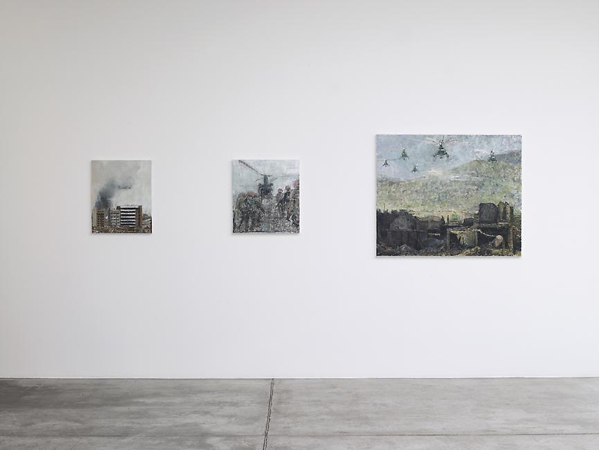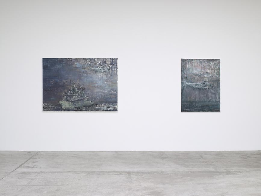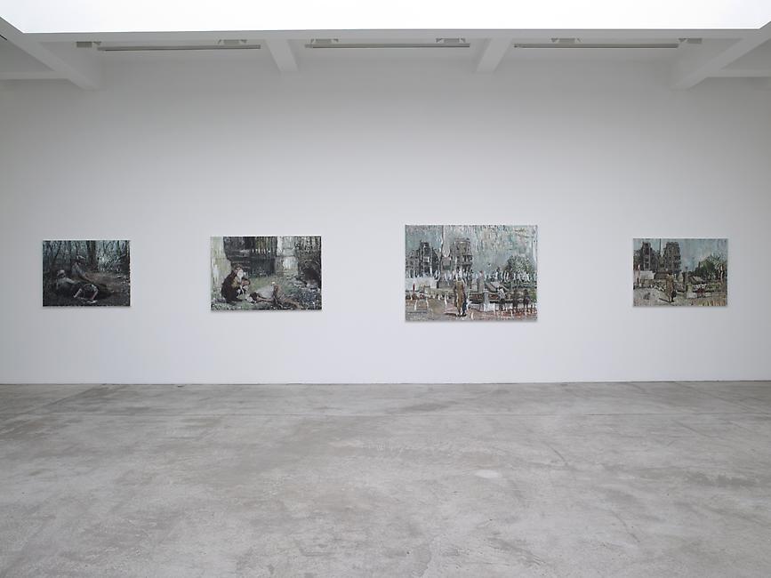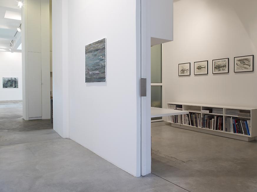 Limbo, the state of being suspended in time, between past and future, repose and action, is the title of Sabine Moritz’s first solo show with Marian Goodman Gallery in Paris. Spread over two floors, the exhibition includes eighteen oil on canvas paintings, and over sixty drawings, a dense body of work started in late 2001. Moritz, who lives and works in Cologne, Germany, was on her way to New York City on September 11th, when her plane was diverted up to Nova Scotia. For three days she was stuck in this remote landscape, with thousands of other displaced travelers, watching the events and its aftermath unfold. This period of waiting and disconnect, gave her time to reflect about the changing nature of borders, conflict, and the technology of war.