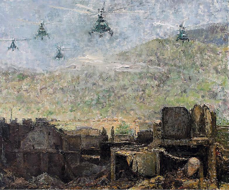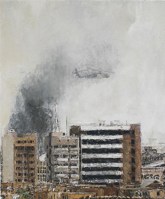 Most of the work in Limbo is culled from press clippings from a variety of publications following 9/11. Helicopters, soldiers, planes, warships, destruction, and chaotic landscapes; make clear reference to the state of war, but abstract the image by withholding any defining identity. Through layers of frenetic, linear brushstrokes, Moritz deconstructs the photographic reference, focusing her vision on isolated moments, hovering objects and figures at rest. She is not interested in showing the violent, graphic images of war, preferring those intimate moments of pause, of limbo. Occasionally we see traces of figures or objects that have been erased, as if they disappeared just before we arrived. There is a feeling of unease, tension, uncertainty, but there is also a sense of calm.