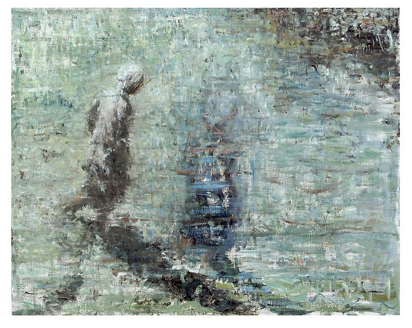 We can’t look at this body of work without thinking about Moritz’s upbringing in East Germany. Born in a small town near the border in 1969, the artist grew up amid the anxiety, economic hardships, and isolation of the cold war regime. She experienced first hand the atmosphere of threat, fear, and displacement like the figures and moments she captures in paint. Limbo is unspecific, unwilling to moor itself in a singular place or identity, and because of this it resonates on many levels. Old or new, the graphic images of war: suffering, fear, and loss, remain the same, and resonate just as powerfully.