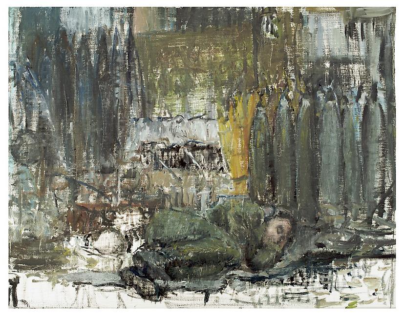 In Sleeper (2010), a lone soldier rests on his side. While the figure seems peaceful, his surroundings are obscured, kept alien and foreboding. Are those missiles behind him? Barbed wire? We have the same feeling of unease with In the Forest (2012), and Flight (2012), which show figures sitting or laying in a dreary landscape. The viewer is uncertain of the intent of the subject, whether they are escaping, hiding, or about to attack. No matter which, traces of smeared, red paint at the feet of one figure does not bode well. Moritz reinforces this unease through the piercing brushstrokes that cut across their bodies and into the dense forest behind.