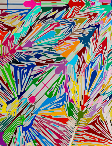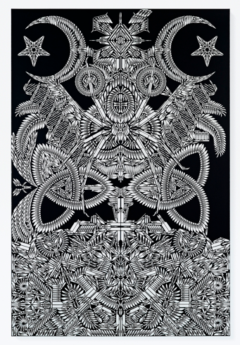 Scalpel Blade Paintings, a new series of work, continues Hirst’s interest in scientific themes by creating intricate, mandala-like forms with thousands of different scalpel blades. While some paintings are monochromatic, others incorporate free use of bright colors, yet all are visually influenced by the light reflecting off each precisely angled blade. The majesty of the blades, similar to Hirst’s use of insects, also play on our deeper fears. The initial comfort of the complex patterns can just as soon turn into discomfort as the scalpel blades become a violent reminder of the limited protection offered by our flesh, the experience of pain and the mysteries of the body.  One can link these works to Hirst’s instrument cabinets of the 1990s, where surgical instruments were used to create highly aesthetic works, while embodying medicine’s futility in the face of our inevitable mortality.