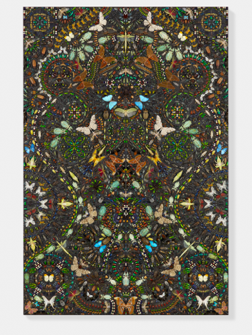 The Entomology Cabinets and Paintings feature works from the artist’s 2009 Entomology series, presented with the addition of thousands of colorful insects, spiders and Hirst’s familiar butterfly motif.  The insect world, to Hirst, is an apt reminder of life’s fragility and delicate irony. Despite delicate wings and an enchanting iridescence (even in death), the harmonic pleasure of shapes formed by the work’s once living material also possesses a discordant counterpoint, the fear and repulsion many feel towards insects. As in other of Hirst works, precise grids become formal attributes of the cabinet works. The insects are positioned by species in orderly rows creating both a scientific and industrial atmosphere. This rigidity, however, is broken with closer viewing, upon which the viewer can spot slight variations and subtle asymmetry.