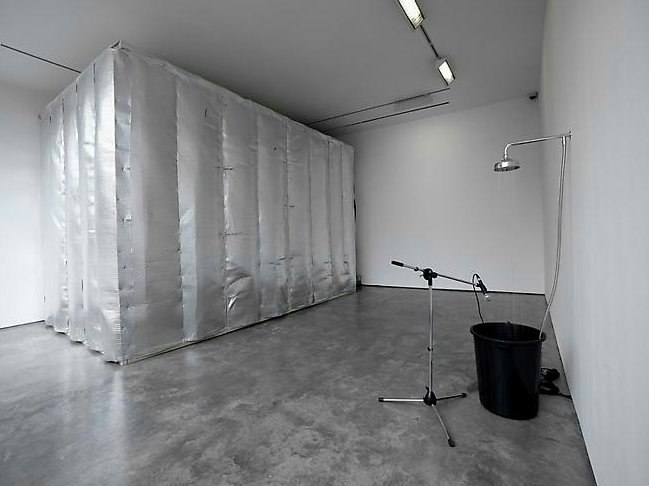 In one of the pale, white rooms of Lisson Gallery’s current show of works by Haroon Mirza, a light continually goes on and off, accompanied by a bizarre whooshing noise. The sound is that of an ant, walking across a small copper plate buried inside of an ant farm, and mixed together with the sounds of a shower head draining into a plastic bin. At turns confusing, surreal and immersive, the viewer cannot help but linger in this minimal environment, seeking to understand the subtle links between action and reaction.