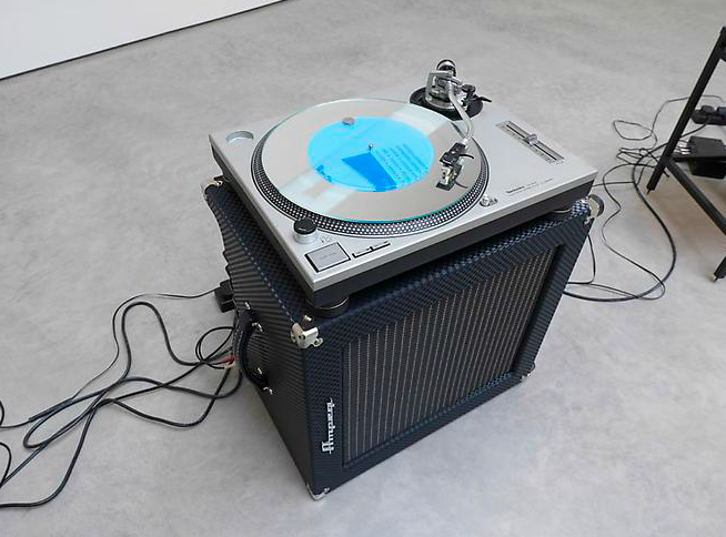 In one work, Mirza appropriates the audio of Alvin Lucier’s seminal sound work I am sitting in a room, using its signature exploration of the audio environment to create a running loop of sonic collage, aided by the sounds of manipulated records, samples and droning rhythms. Combining modern approaches to remixing with material outside the traditional dialogue of contemporary popular music, Mirza ties the act of listening with a cultural image of creative production, running independently of any user’s hand as a way to reestablish and remix the actual practice of Lucier’s original work, substituting the circular turning of record players for the artist’s microphone recording loop.