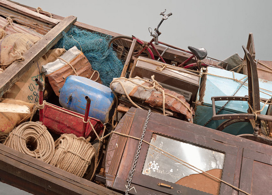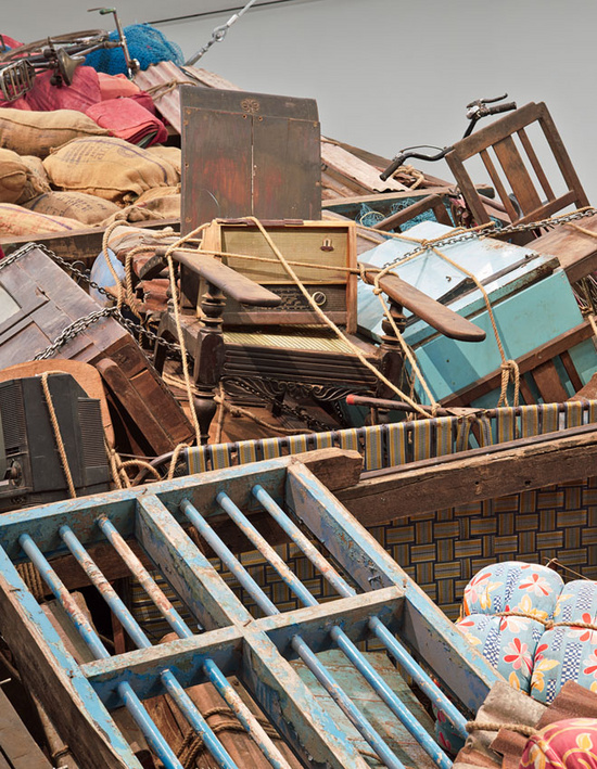 The magnitude and complexity of the work creates an almost numinous experience for the viewer. The boat is tilted, as though it is riding a wave, and its angle creates the impression that the myriad of objects are about to tumble out of the vessel to be lost at sea. The composition appears to be frozen in time at the point of suspense and turmoil. The longer one gazes at the installation, the more details are realized, from the twisted wires holding the pans together to the broken mirror of a cabinet door. The sculpture raises philopshical and political questions regarding cultural and personal identity in the globalized world. This issue is particularly poignant given Great Britian’s imperial control of India.