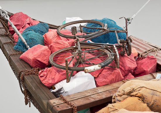 The piece is comprised of a gigantic boat suspended at an angle from the ceiling, which is filled with commonplace objects including chairs, beds, window frames, fishing nets, plastic jars, cans, an old radio, cooking pots and pans, a suitcase and a bicycle. A traditional fishing vessel from Kerala, India, the vessel measures seventy feet in length and ten feet in width, and occupies the entire stretch of the gallery, weighing 4 tons.