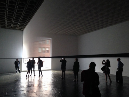 Just completed this past week, the Whitney’s installation of Black Rectangle – Scrim Veil – Natural Light is a perfect example of Irwin’s experiments in perception and space during Los Angeles’s Light and Space movement of the 1970’s. Initially constructed at the museum in 1977, this particular work stands as one of Irwin’s last explorations into the potentials and possibilities for light and shadow before he began exploring the potential of environmental art and landscape installations, marking a peak in the artist’s refined techniques and developing aesthetic voice. Using minimal materials, and complementing them with natural light or a single light source, Irwin welcomed environmental intrusion into his works, expanding the space of artistic perception to cover enormous enclosed spaces. Allowing the density of light and materials to affect the viewer’s perspective, Irwin pioneered new modes of seeing and exploring the gallery space.