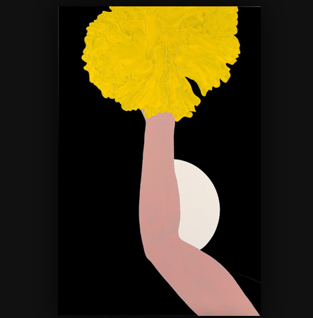 Particularly noticeable in this exhibition is Hume’s focus on bold color, line, and surface. A mixture of joy and melancholy, the works are consistently defined by strong color palettes, often relying on dark, heavy colors to convey their emotional weight and heft. In some, the creative uses of color and form hint at narratives, exploring the raw semiotic power of images and shapes placed in challenging, often specifically confounding assemblages. In one work, The Moon, he places what appears to be a single cheerleader’s pom-pom, held aloft by a long, slender arm. The white, lunar orb emerges from behind the joint of this appendage, all executed with a reductive style that opens large swaths of the painting to interpretation, and often challenges the viewer’s ability to connect the dots.