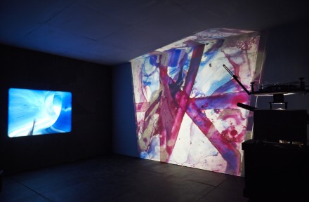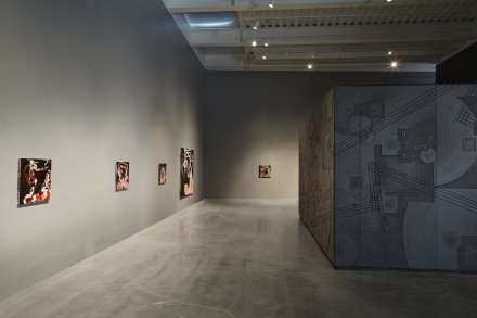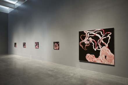 Gallagher’s newest paintings surround the black-box installation.  All untitled works, Gallagher created images on the verge of abstraction by scraping away layers of red and pink foundations, and using ink to enhance silhouettes and forms of the canvases that are all of the same size and format. Some look like coral, or worm-like organisms, another features a bird perching on a branch.