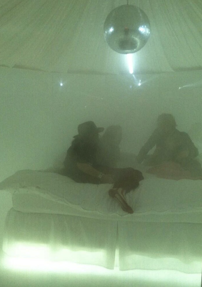 Taking up nearly the full grounds both inside and outside of the cavernous Riverfront Studios building, the first night of the event was a fitting kick-off to the event. An enormous smoke-bomb collage by Olaf Breuning both opened and closed the proceedings, drifting thick, dyed smoke past the heads of the early attendees, and over out over the East River, where a series of temporary yurt structures invited participants to wander freely in and out. Inside each yurt, artists had been invited to create their own immersive installation, from Urs Fischer’s smoky, disco-ball and mirror room, where visitors were welcome to lie on a bed and converse while others circled the room confusedly, to Liz Glynn’s “Big Bang,” a pitch black maze with the artist waiting at the middle narrating the origins of the universe (a fitting theme for the first night of the event). Nearby, Ernesto Neto’s yurt took a more tactile approach, constructed from a soft, elastic fabric that gave the impression of an adult-sized fun house.
