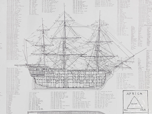 Taking a child’s willful incorporation of its surroundings, and inherited history as a starting point, Sachs places Barbie at the center of America’s dark history of slave trading, underlining tacit links between advertising, which he classifies as a manipulation of the mind, with physical capture and forced labor. Sach’s sculpture seems a warped take on both sides, welcoming a narrative bent that joins them together. It’s difficult to tell who is remaking who in the sculpture, whether the child’s environment is overshadowed by the dark history of human trafficking, or if the youthful, empty idealism of the Barbie is bending the slave ship through its own lens.