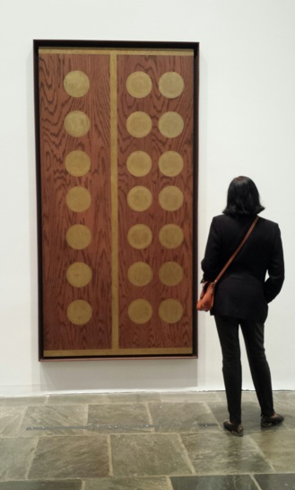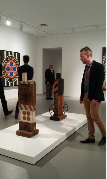 The final room is an almost reverse chronology of his developing abstraction. Featured alongside pop-looking canvases are his earliest abstract images, of gold orbs on monochromatic ground, like large scale dominoes. Immediately beside these stark geometries are Indiana’s two earliest New York pieces, Mene Mene Tekel and Upharsin, which are also the most expressionistic. Begun in 1955 and later modified with text in 1992, they feature large bulbous heads of biblical figures, executed in a thick impasto with tiny sticks jutting from its surface. They are closer to expressionism than the hard-edge geometric and graphic paintings he is known for, and remind us of the transformation in his style over a half-century long career.