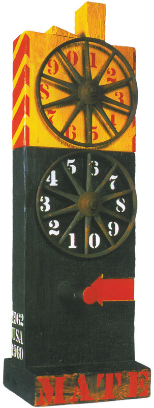 Juxtaposed against the flat, two-dimensional paintings, Indiana’s sculptures retain a certain hard-edged flatness and geometry, even in the round. These early assemblages, made of found wooden and metallic refuse, are stamped with the same painted font that graces the walls, reciting familiar words, shapes and symbols in bright colors on their raw wooden trunks. These totems, collectively titled Herms, take on an anthropomorphic presence, their wheels almost limb-like, and the unmistakably phallic protrusions a close allusion to the apotropaic Greco-Roman posts for which they are named.