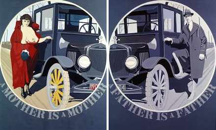 Viewers are immediately greeted by one of only a few figurative paintings—a double portrait of his parents. The enigmatic diptych is split into two mirror images of his mother and father, each in a state of semi-undress. Gazing outward while stepping into a Ford Model T, (perhaps an allusion to his own origin mythology, in which he claims he was conceived in the back of a Tin Lizzie), this mysterious couple is also divided into color and black and white – his mother’s suggestively red cloak opposing a completely gray-scale father figure. The insistent epithets under the portraits, “A Mother is a Mother; A Father is a Father,” may allude to his adoptive parentage, their broken marriage, or perhaps simply communicate a more universal axiom and rigid social dialectic.