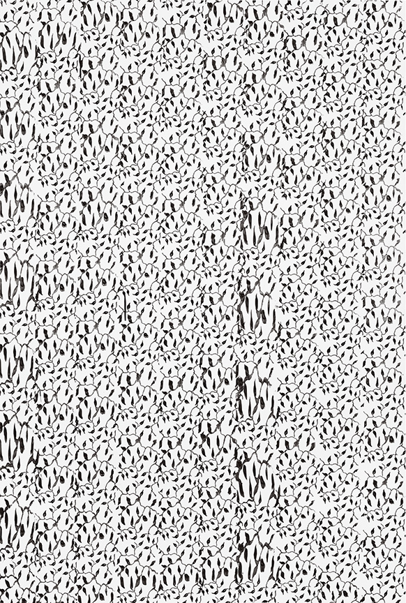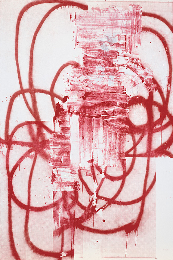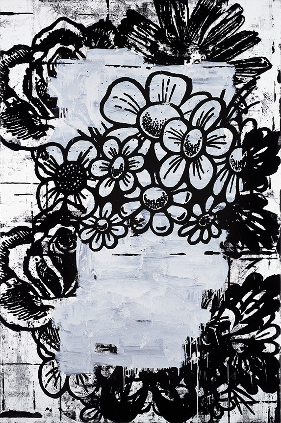 This trend is perhaps best elaborated by Wool’s patterned canvases, inspired by paint rollers used to mimic the design of wallpaper in low-rent tenement housing. Wool uses the minimal patterns to create subtle smears and blots, underlining the roller’s inherent flaws, and the flimsy aesthetics its meant to convey. Using these banal patterns and floral arrangements as a new starting point, Wool occasionally slurs them with huge gobs of paint, letting the thickly applied layers cluster and bulge, bleeding through each other as they settle on the paper.