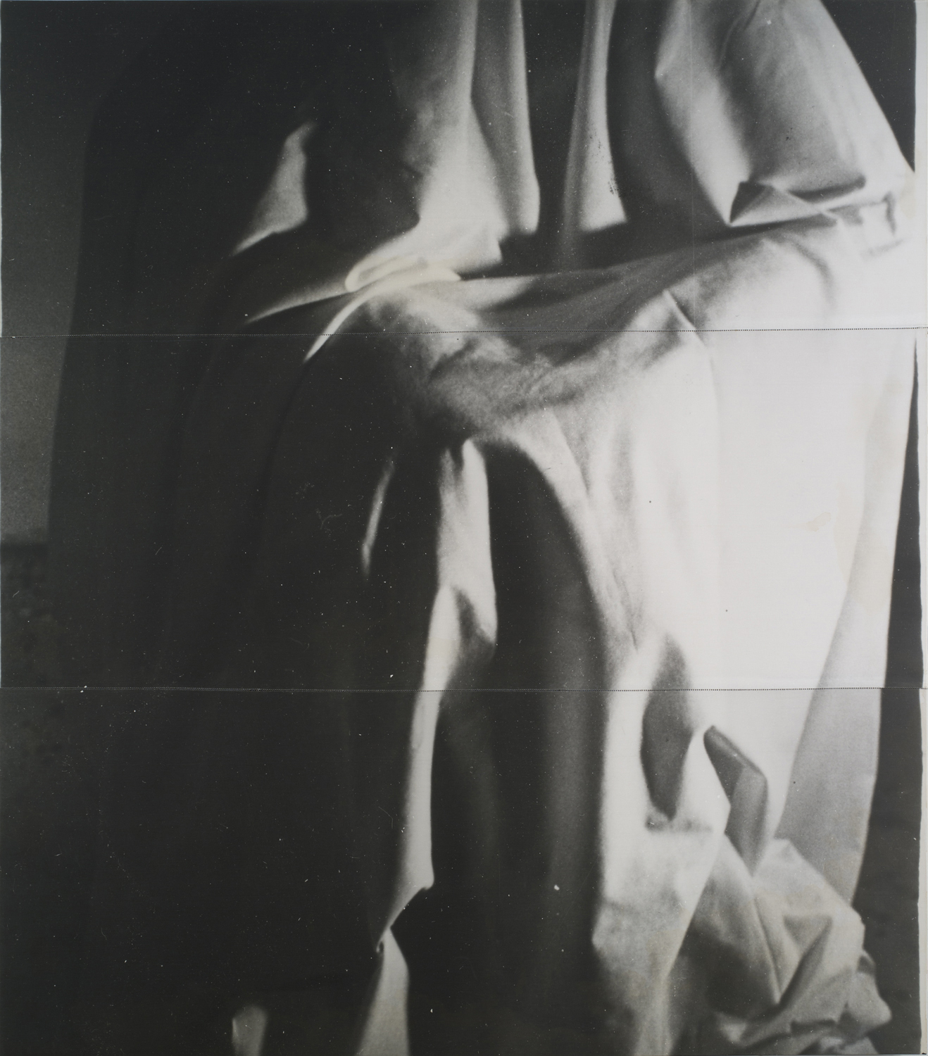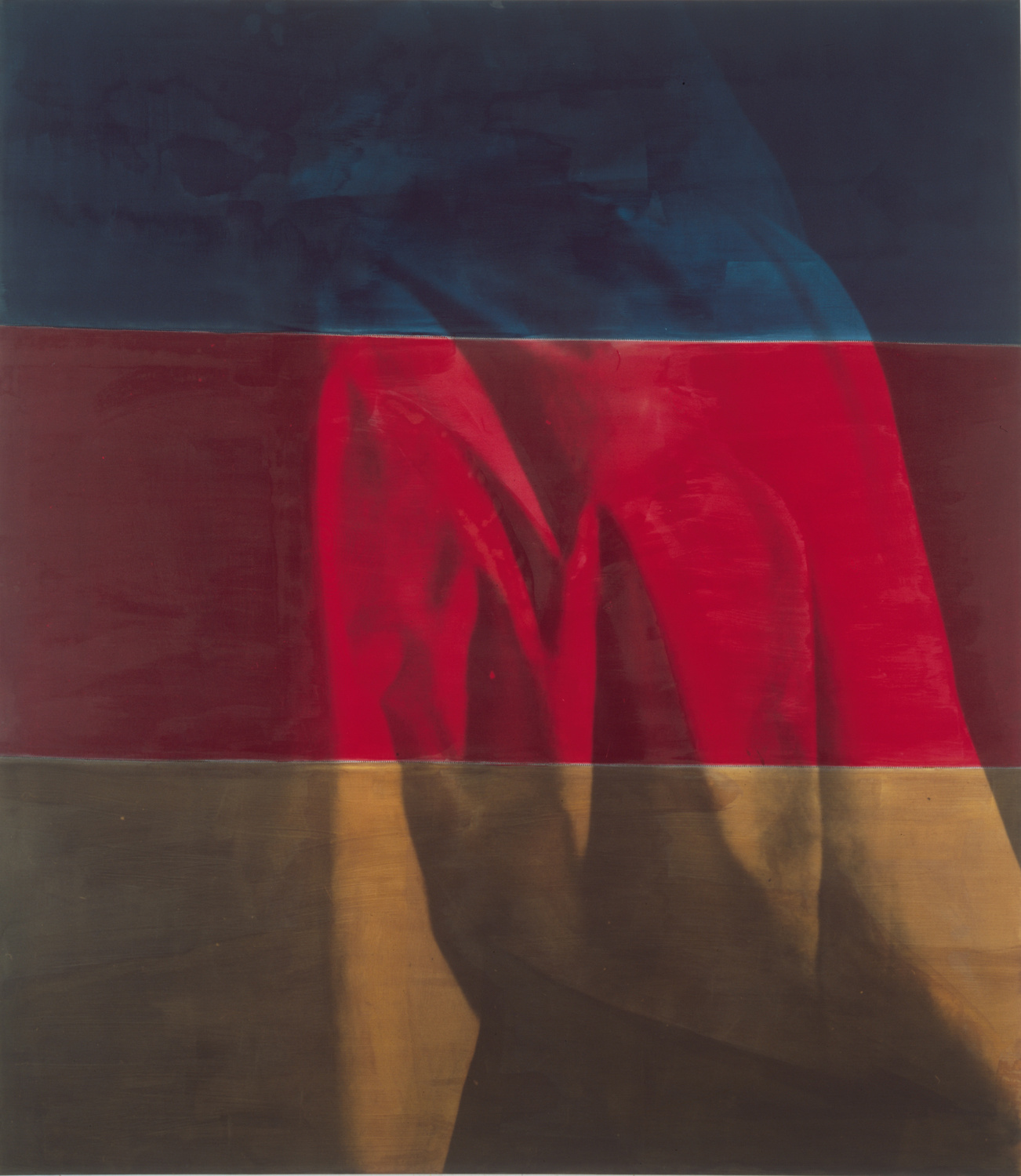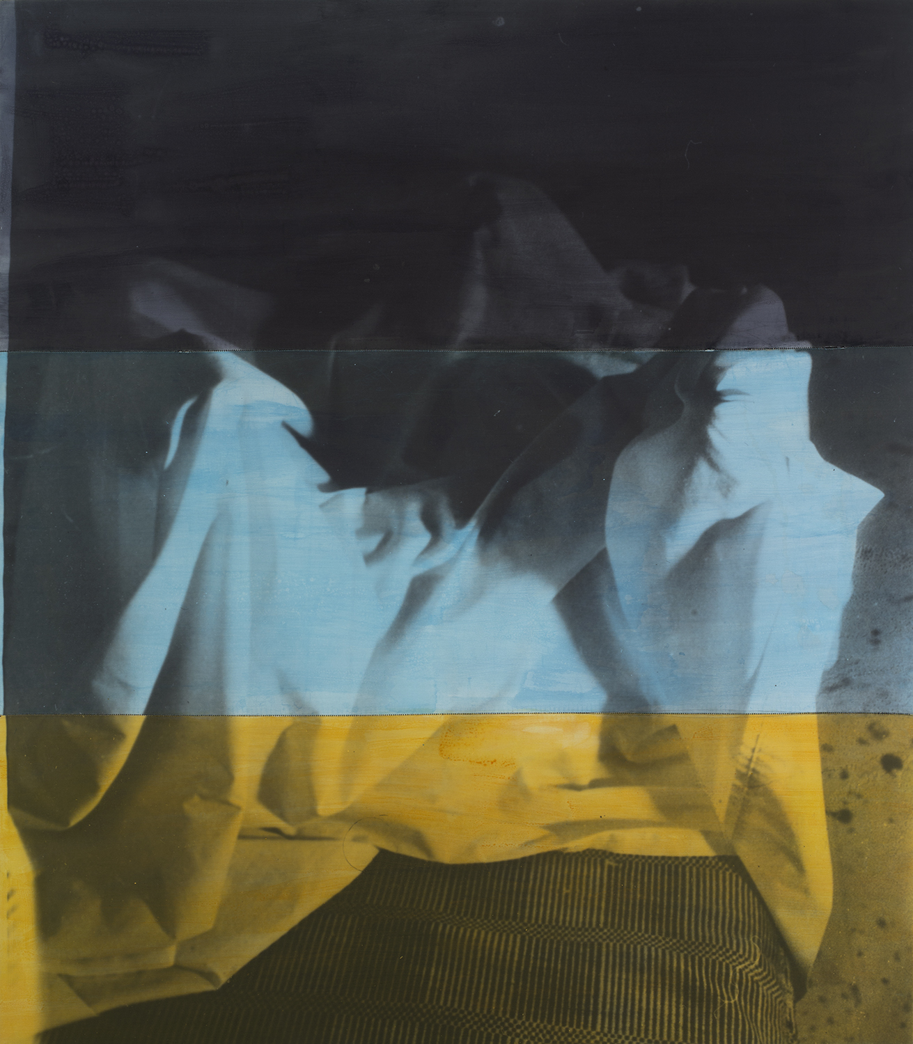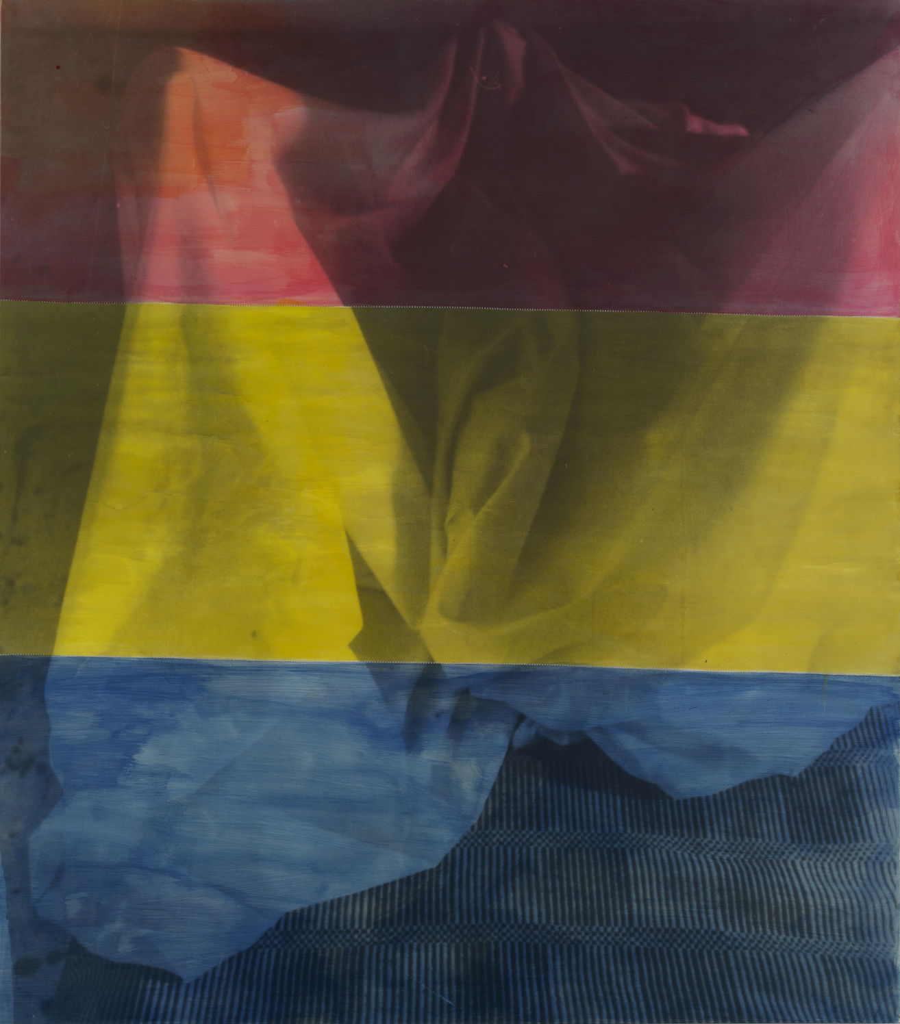 Starting with the movements and photos of his longtime model and collaborator Beverly Eaby, Salle took the resulting shots, and printed them onto enormous linen sheets using dark room printing processes, then stitched the sheets together, resulting in large-scale, stretched works that exhibit slight alterations and flaws in the surface of the image, jagged points where the lines of the photograph fail to come together. From here, Salle coated the canvases in calligraphy ink, leaving colorful bands of color that demarcate the separation of the final work into its contingent pieces.