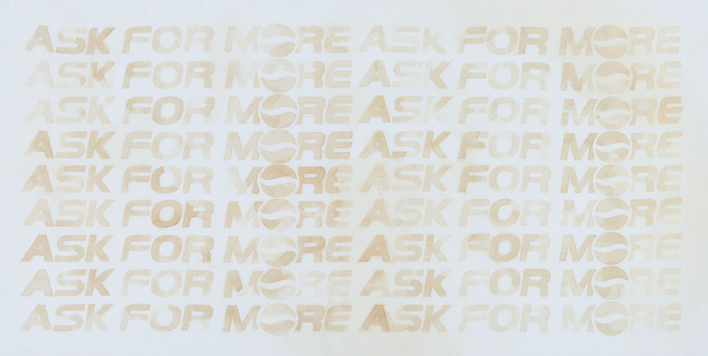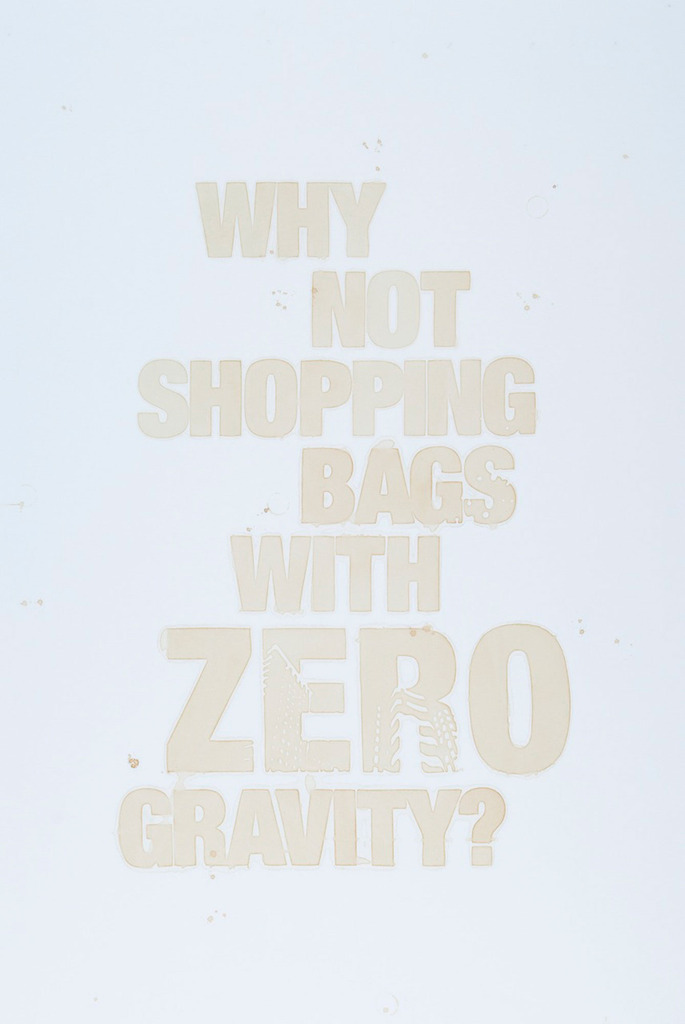 Nearby, Bouchet’s Ask For More drowns the viewer with that titular Pepsi slogan eighteen times. Similar to J.D. Salinger’s Jesus Prayer in his classic work Franny and Zooey, the multiplied motto “Ask For More” fills the entire canvas, and forms its backdrop until the words become subconscious and imperceptible. In equal measure, the discoloration caused by the golden caramel come to the fore. Bouchet’s Zero Gravity also provokes the unconscious, a Zen koan asking the almost incomprehensible question, “Why not shopping bags with zero gravity?”
