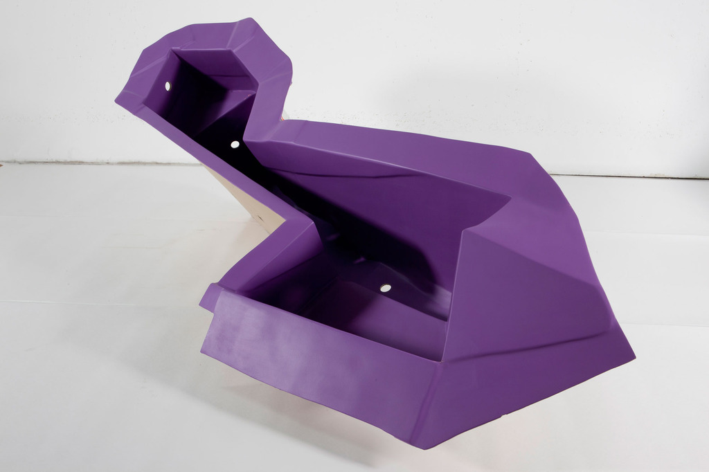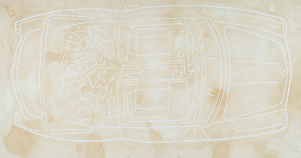 For referencing a deluge with the title Flood, Bouchet’s exhibition resounds most with ideas of emptiness, particularly in his sculptural work Olsen Twins Jacuzzi. The name implies the lollipop-purple sculpture is made for two, but the sculpture is unfortunately not wide enough for even a single person to taste that pleasure. Other works, like Double Cowman Country and Picnic, use the white, negative space of the canvas to reference lines and outlines, similar to some images perceived in a Rorschach test.
