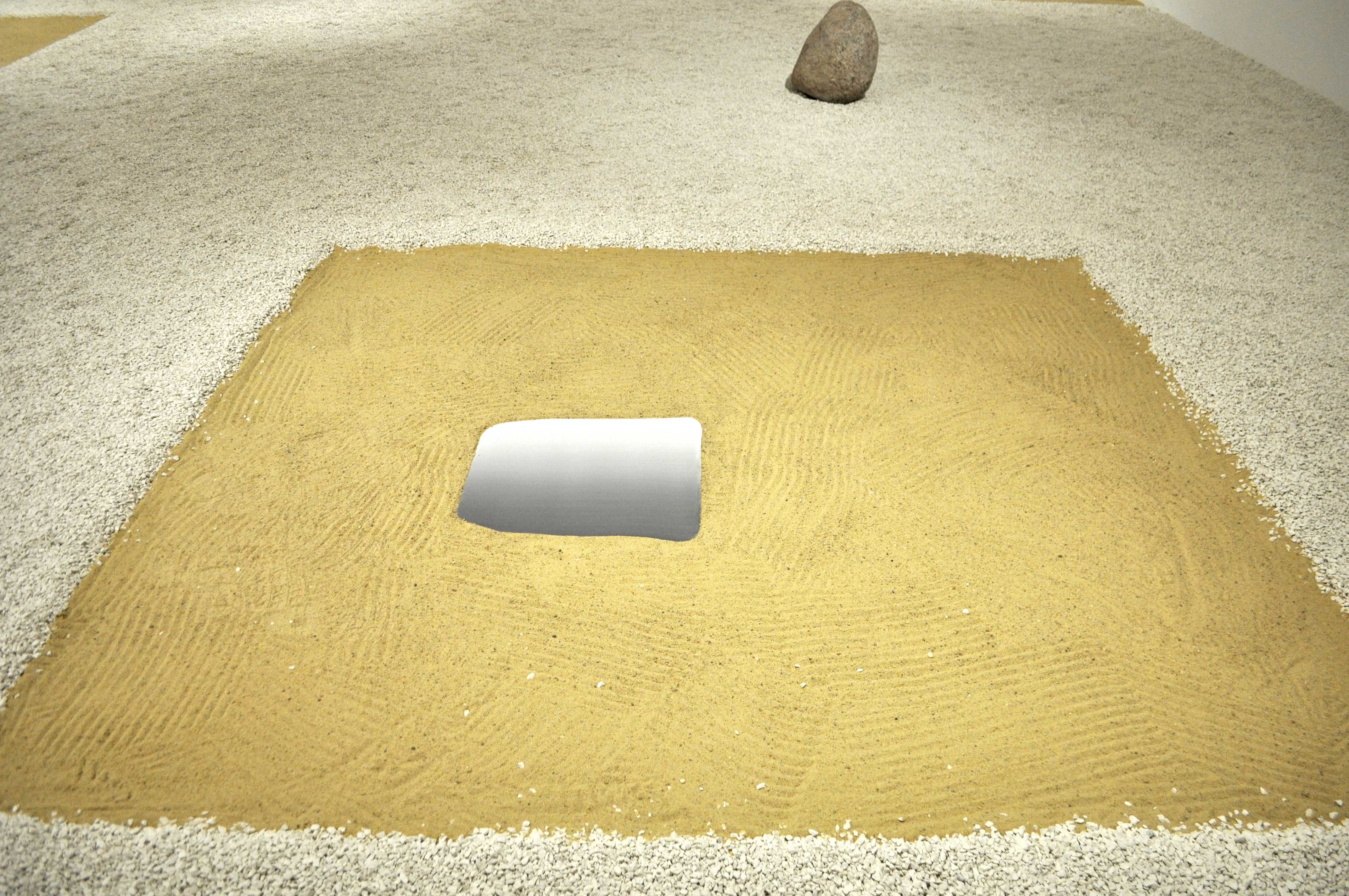 Accompanying the artist’s paintings is an installation, on view in the gallery’s adjacent building, where Lee recreates the imagery and contemplative atmosphere of the Zen rock garden. Nodding to his studies in Japan, the artist translates his now well-exercised form to a more physical locale, providing a new contemplative environment while altering the relation of the viewer to the image.