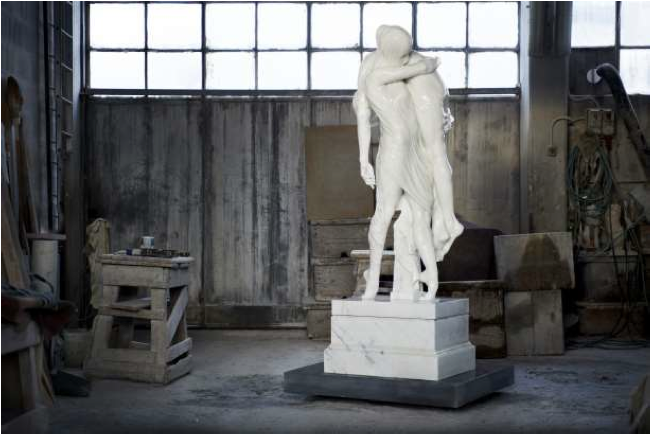 Ballerina and Boy (2013) emphasizes the separation between the individual and the society they are a part of. This is symbolized by a metaphorical veil, allowing people to hide their own reality from others, and personified by an erect, physically “perfect,” even “weightless” ballerina carrying the body of a lifeless boy. The ballerina’s work seems effortless, although the task is evidently extremely heavy and requires much effort to achieve.