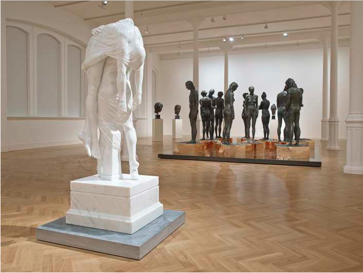 On view at Pace London through mid January is an exhibition highlighting new sculptures by Irish artist Kevin Francis Gray. These realistic, detailed works were crafted from bronze and marble in a traditional manner uncommonly seen in the contemporary art world. Included in the display are five double life-size bronze heads, a group of twelve life-size nude figures cast in bronze, and a life-size sculpture of two white marble figures alluding to the tradition of covering of dead bodies in Judeo-Christian cultures.