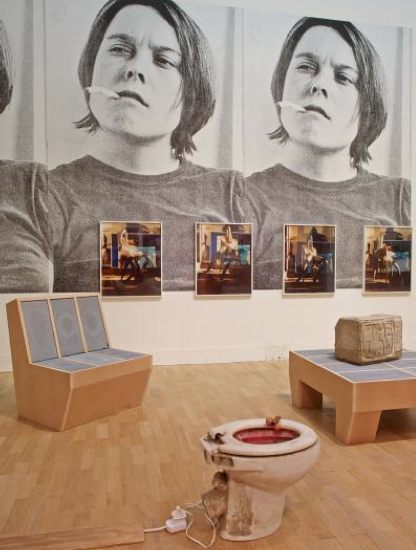A selection of Sarah Lucas’ sculptures and installations, made with found objects and everyday materials, have been included in this retrospective, specifically a series that was inspired by Hugh Heffner’s playboy mansion. In the show are art objects Lucas created to be stuffed: brownish, skinny “playboy bunnies” collapsed slouching into chairs appear as objectified, disposable, and lifeless. Another sculpture features a beige pair of legs sitting on a toilet. Almost all of the figures in the retrospective are without any heads or faces, except for the photographic portraits of Lucas herself.