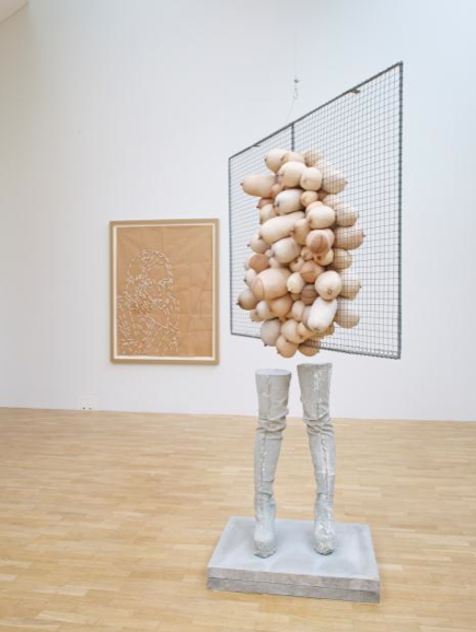 Also frequently used are vegetables, especially relatively colorless ones such as butternut squash and potatoes, arranged on a metal wire grid, suggesting female breasts. The exhibition also includes her liquid-like, light-reflecting bronze representations of limbs of the human body, as well as photographs of men naked from the waist down, hiding their genitals with objects such as a beer can, a slab of meat, cookies and a milk bottle.