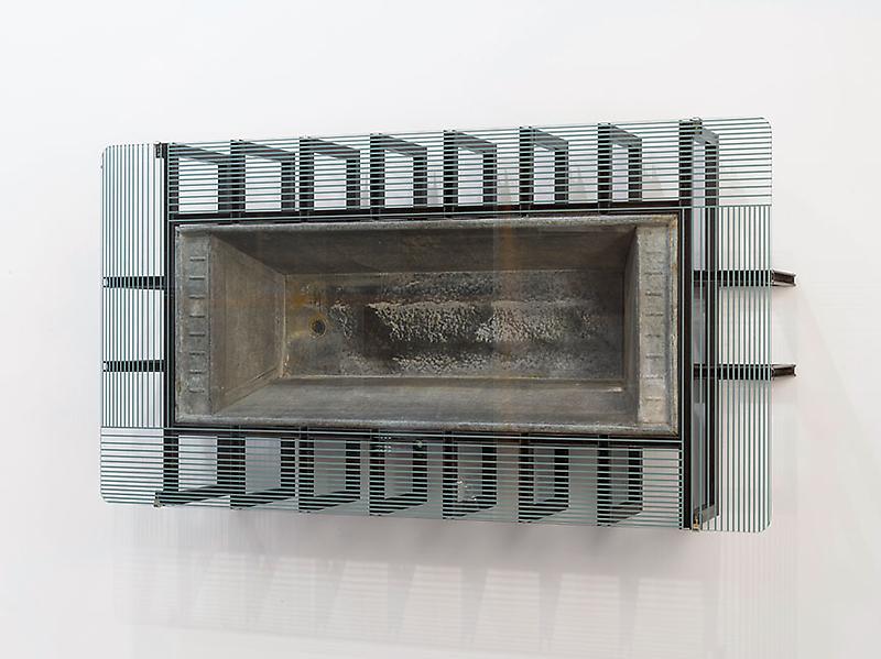 Mucha seems fascinated with the geometries of modernity here, particularly that of the railway, which makes itself felt throughout: cracked rail ties, broken track and the near-omnipresence of parallel steel bars all take their turn as compositional elements, presented in enormous, wall-mounted pieces, occasionally adorned with vaguely Art Deco detailing. Steel and wood hover somewhere between the sterile observation of the museum and a certain material potency, covered in dirt and grime that hearkens back to the pieces’ possible former uses.