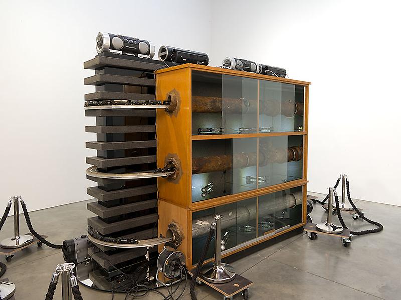The first steps into Reinard Mucha’s show of new works at Luhring Augustine are something of a jarring affair. Enormous wall-mounted pieces, composed from steel beams, glass casings, and cracked wood blocks are stacked on top of each other in bizarre, serial constructions. In one work, a series of electric trains continually run through a series of stacked, oval tracks, running through metal pipes, joined by a series of boom boxes above the sculpture, all tuned to country music stations.