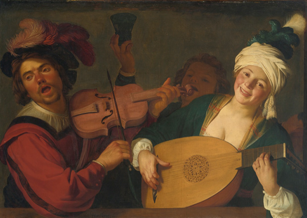 Gerrit Van Honthorst, A Merry Group Behind a Balustrade With a Violin and a Lute Player, via Sotheby’s