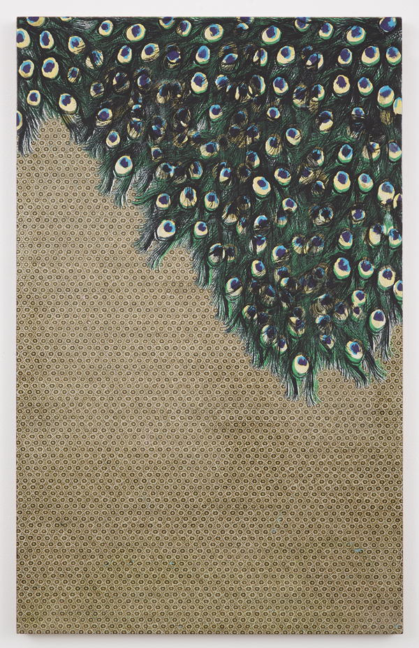 In other works, the artist introduces a new motif, the classic, symmetrical natural pattern of the peacock feather. The engagement of the traditional marquetry support and this multi-layered surface painting is fruitful. As the press release states, “In these palimpsestic hybrids, Avini’s overwriting obstructs and complicates the language of the traditional designs, both in a visual and conceptual sense.”