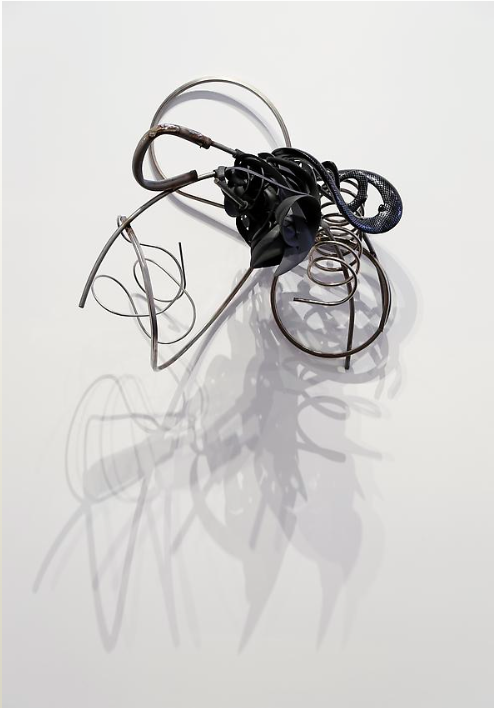“Circus” is Stella’s most recent group of work, in which he focuses on the “tradition of artists contemplating and working with circus imagery and form,” particularly reminiscent of Alexander Calder, for example. The series was begun in 2009 with Stella’s “Circus of Pure Feeling for Malevich: Four Squares,” an arrangement of 16 small free-standing “ProtoGenic” sculptures, separated onto 4 rectangular tables meant to represent humorous, absurd dances. The coiled, ribbon-like sculptures create an illusion of weightlessness, which is new to Stella’s work, as described in the New York Times review of their original presentation at Paul Kasmin Gallery in New York. The central parts of the sculptures are smaller than the “Scarlatti K” series, but the supporting structures that hold them are larger and more energetic, described by Peter Freeman, Inc. as creating a feeling of “an almost atomic energy.”