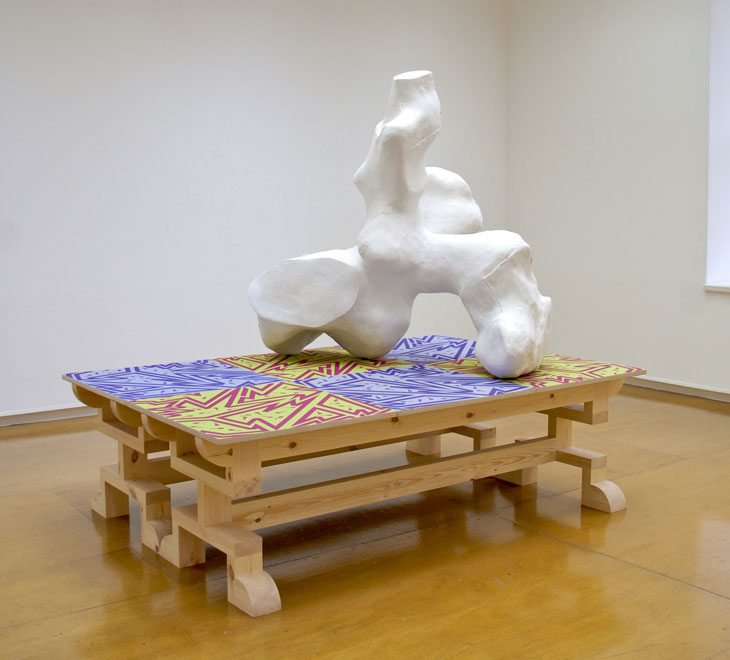 The works vary in medium and form, from Finbar Ward’s painted wooden boxes to Mary Ramsden’s monochromatic silhouette landscapes and Oliver Osborne’s photographs and cuts. Most common among the works are the mediums of sculpture, installation, video, and painting, many multimedia works appear inspired by the medium painting while incorporating a variety of other media. Tom Gidley’s oils on linen, for example, spring from his painted canvas onto a different surface, and Dan Rees has extracted color from Plasticine in order to create painterly works on panels.